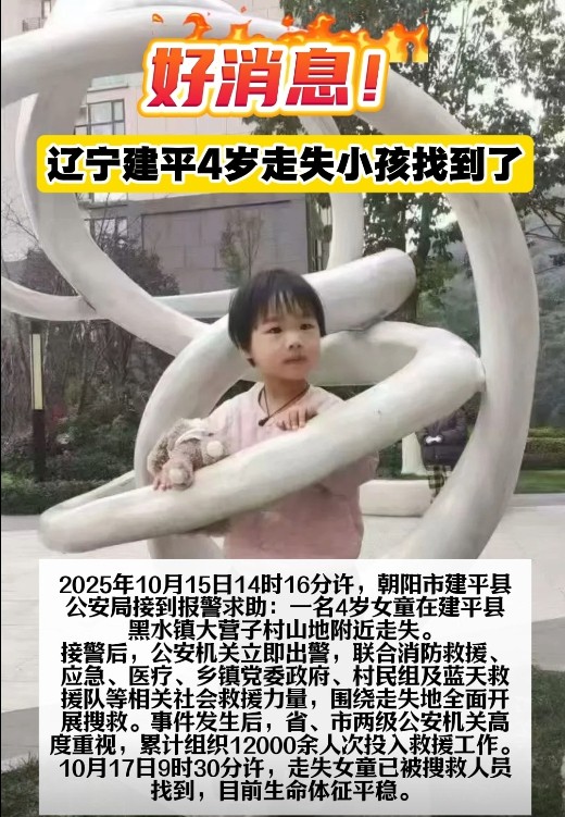 2025年10月15日14時,當“4歲女童走失”的警情從遼寧建平傳出,一場跨越地域與身份的愛心接力就此啟程,最終以“生命體征平穩(wěn)”的消息畫上圓滿句點。這不僅是一次搜救的成功,更是一幅“一方有難八方支援”的生動畫卷。